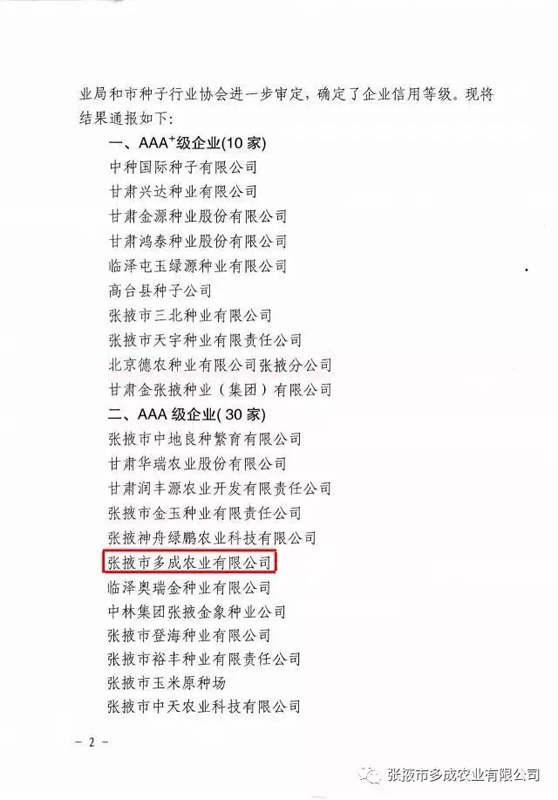 | 熱烈祝賀張掖市多成農(nóng)業(yè)有限公司被評(píng)為2017年度信用等級(jí)AAA級(jí)企業(yè)! | ||